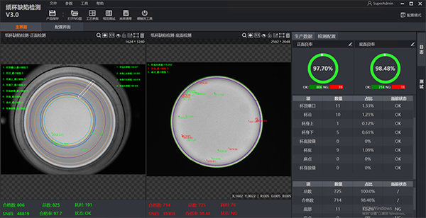 在某纸杯生产厂缺陷检测项目中,现场使用“1拖2”方案实现杯内壁和杯底的缺陷检测,实时显示每个纸杯口部、纸杯底部缺陷,操作人员一目了然。检测结果由IO信号输出,有效进行分类剔除,大幅提升生产效率。