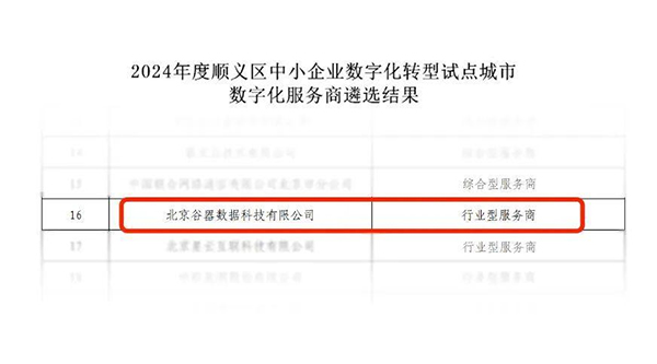 此次入选北京市顺义区中小企业数字转型试点城市数字化服务商,也是谷器数据继成功入选北京市昌平区数字化服务商后,再度凭借过硬实力斩获北京市试点城市服务商的殊荣。未来,公司将继续凭借在数字化领域卓越的专业能力和丰富的实践经验,全面协助顺义城市试点工作目标,为推动细分行业的中小企业数字化改造,提高数字化服务能力供给水平,推动打造链式”转型标杆,贡献谷器智慧和力量!