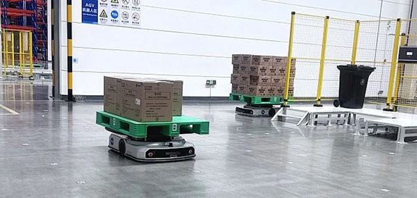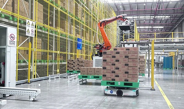 拣选出库:AMR与输送线对接,将托盘货物从立体库区自主运输至库卡机器人自动拣选区,库卡机器人将商品箱从托盘上拣取至轻载输送线上发货出库。