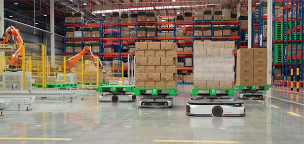 引入15台KUKA AMR KMP 1500i替代地面固定输送设备,提高库前区10%的可使用面积,实现人机混场的高效协同作业模式,打造自动化、无人化高效物流配送。