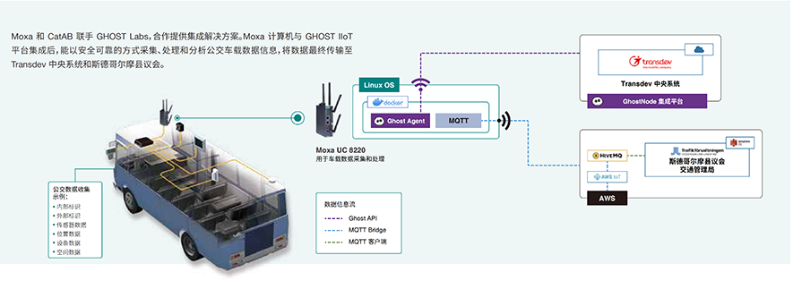 Moxa 与软件供应商 GHOST Labs 合作,实现了公交车辆的全方位监控。GHOST Labs 负责关联、调整和监控所有车载系统和计算机数据,并根据政府要求向 Transdev 的 AWS 平台和公共交通管理局(TF)发送汇总信息。