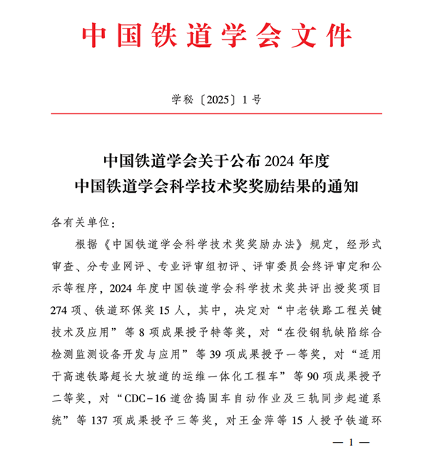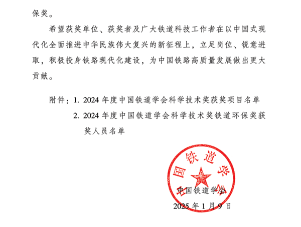 ● “面向智能安全运维的高韧性轨道电路装备关键技术及应用”科技成果荣获2024年度中国铁道学会科学技术奖二等奖。