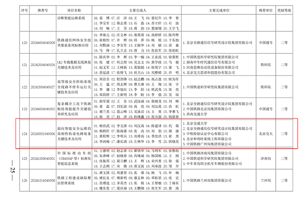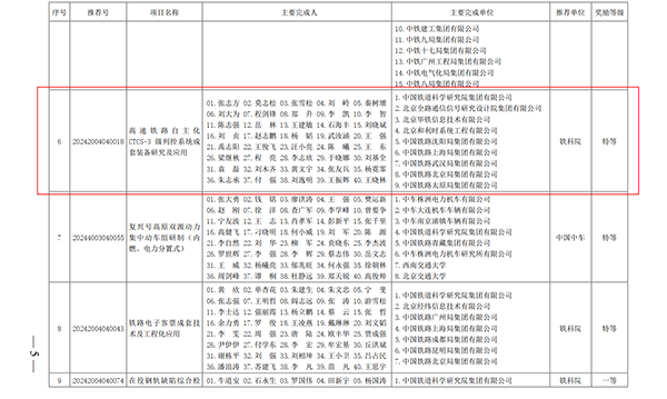 ● “高速铁路自主化CTCS-3级列控系统成套装备研究及应用”科技成果荣获2024年度中国铁道学会科学技术奖特等奖。