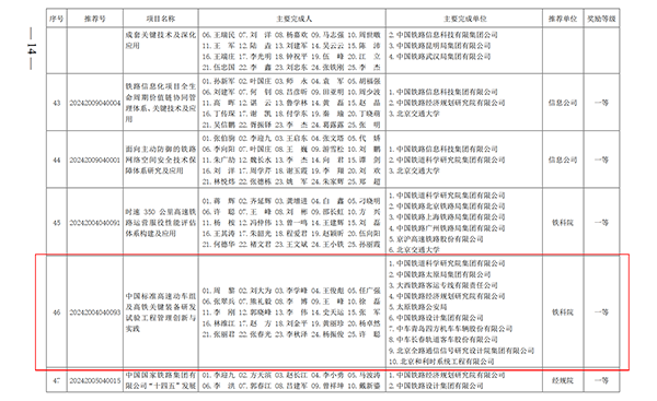 ● “中国标准高速动车组及高铁关键装备研发试验工程管理创新与实践”科技成果荣获2024年度中国铁道学会科学技术奖一等奖。