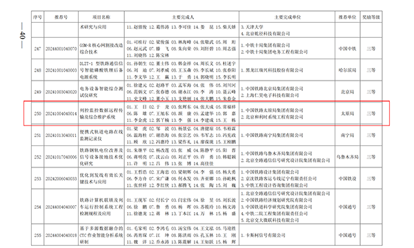 ● “列控监控数据远程传输及综合维护系统”科技成果荣获2024年度中国铁道学会科学技术奖三等奖。