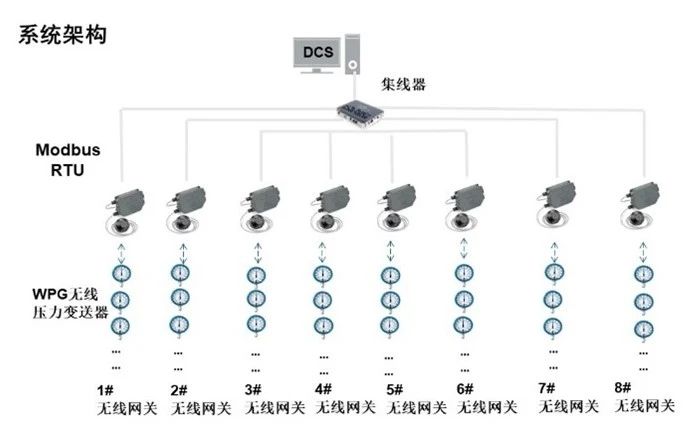 现场选用了146台无线智能压力表WPG、8台无线中继781和8台无线智能网关1410S,将现场的数据信号由无线网Modbus TCP 方式通过网线接入交换机后,送至监控系统的上位机或DCS处理。