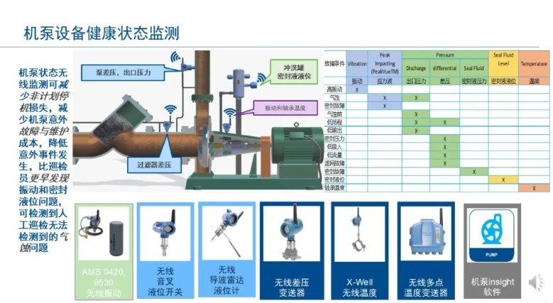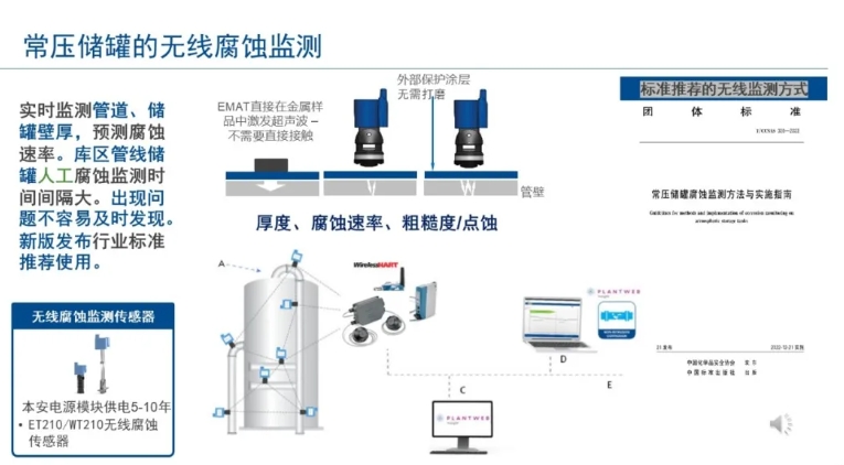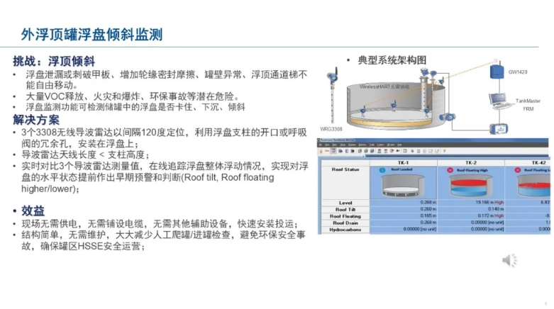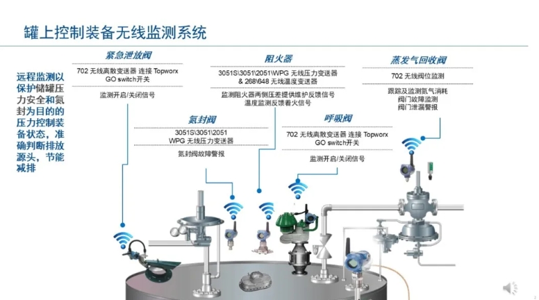 艾默生罗斯蒙特罐区智能化改造的无线典型方案除了管道健康状态无线监测、外浮顶罐浮盘倾斜无线监测系统、罐区典型无线液位监测外,还有常压储罐的无线腐蚀监测、机泵设备健康状态无线监测系统、罐上压力控制装备无线监测系统、手动阀门防误操作无线监测系统等等: