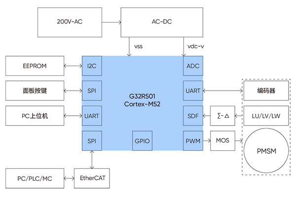 ● 单芯片方案,基于Cortex-M52双核架构,主频250MHz,通过CPU0处理位置环、速度环、I/O状态、以及协议处理;通过CPU1处理位置通信、电流环以及PWM输出;