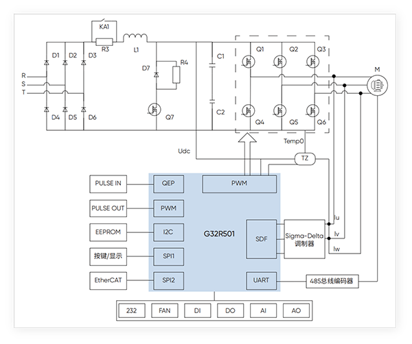G32R501 400W EtherCAT总线型高压伺服控制器量产级参考方案,采用双核并行处理设计架构,其中CPU0中断处理时间低至13.6μs,CPU1中断处理时间低至8.6μs,可支持客户实现更高性能、更丰富功能的产品设计。