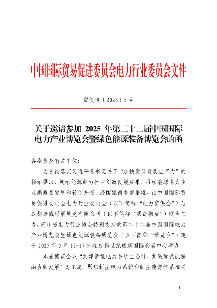 1月24日,中国国际贸易促进委员会电力行业委员会印发《关于邀请参加2025年第二十二届中国国际电力产业博览会暨绿色能源装备博览会的函》,邀请各委员及有关单位参加本次博览会。