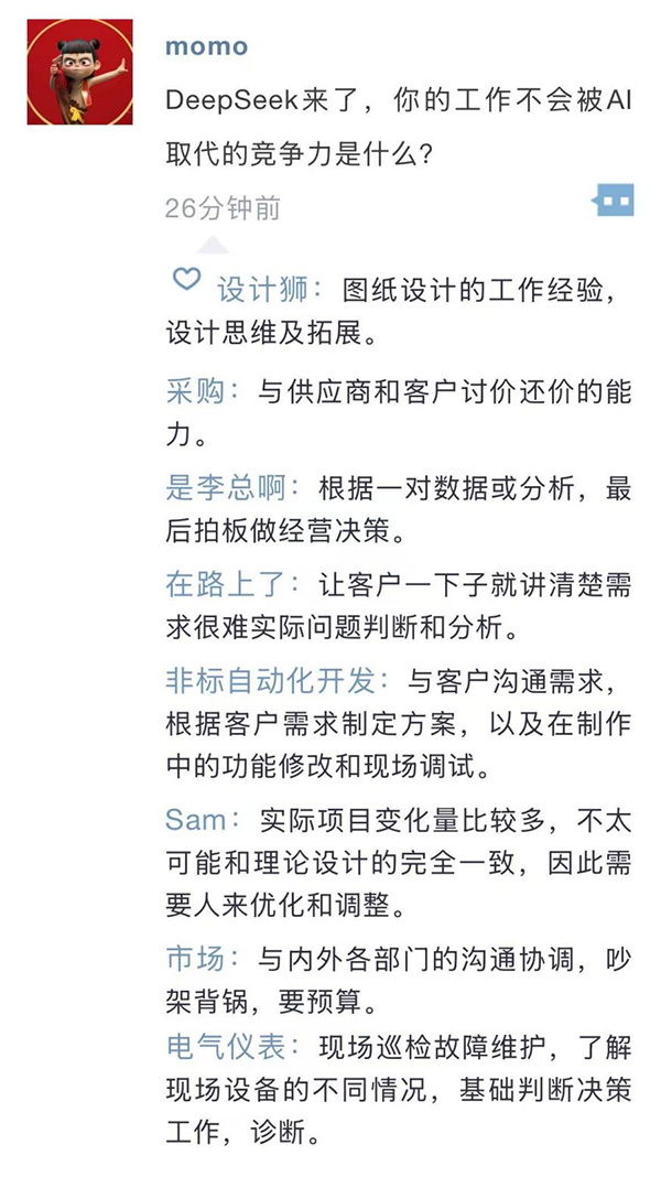 所以对于更加注重经验,现场沟通,定制化的自动化行业,从业者对于AI是否取代的观点仍比较乐观。根据小范围调查,25%的人认为完全不会担心被AI取代工作,33%的参与者表示1~3年内工作不会被AI取代。