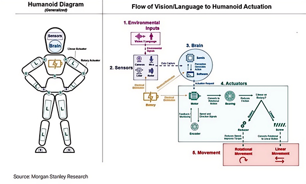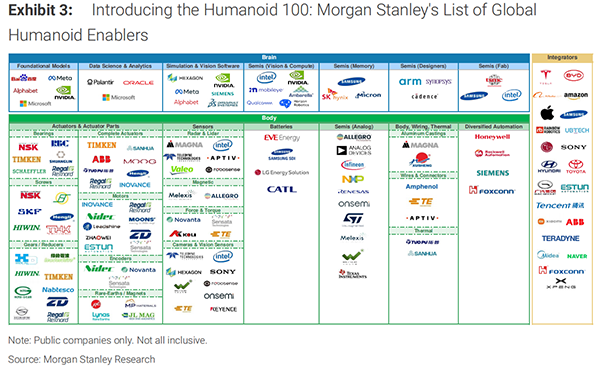 这份百强榜单,摩根士丹利将人形机器人领域分为了三大板块:大脑、身体、集成商。
