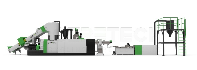 最后由艾斯瑞特的压实造粒机进行再造粒,整套系统稳定高效,生产的粒子可直接投入生产线,进行吹膜管材挤出和注塑生产等工艺,实现PE的全生命周期回收。