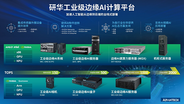 研华打造了全栈式边缘AI硬件矩阵,从微端到边缘云:包括AI模块、AI板卡、AI 加速卡、AI 嵌入式和工业平台,AI边缘平台、边缘AI服务器,乃至边缘整机柜服务器。算力范围从5 TOPS至2000+TOPS,用户可根据业务场景灵活选型,实现精度与效率的最佳平衡。研华希望与伙伴携手,以“边缘原生智能”重塑工业生产力!