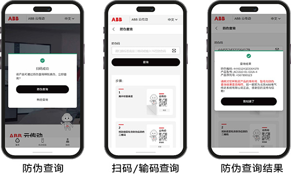 微信扫描云传动防伪标识表层二维码➡ 进入ABB云传动网站➡ 点击“防伪查询”➡ 揭开防伪标识表层,扫描或输入底层防伪码➡ 查看防伪查询结果