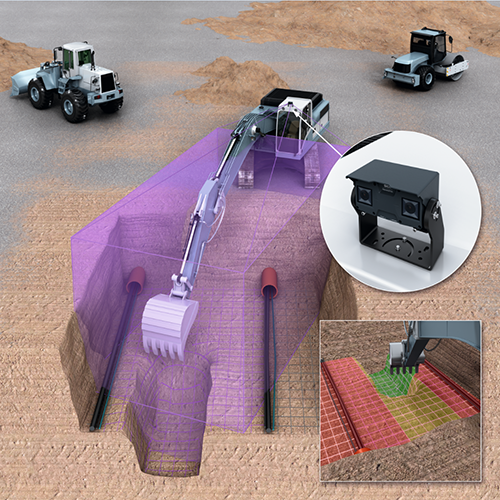 应用1:配合挖掘机,探测土方形态,指引挖臂方位、深度等。