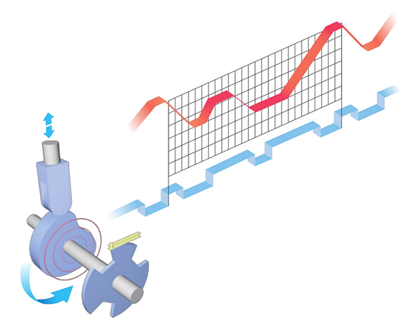 ■使用电子凸轮功能,旋转轴作为虚拟主轴,使旋转軸、放卷轴、插入轴三轴同步运作,并提高三轴的同步时间,可实现插纸速度的提升。