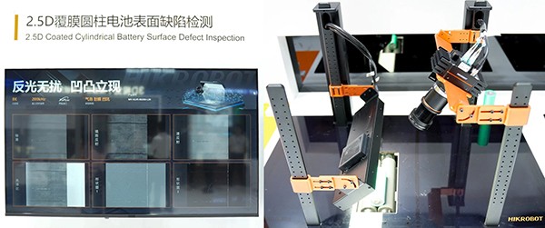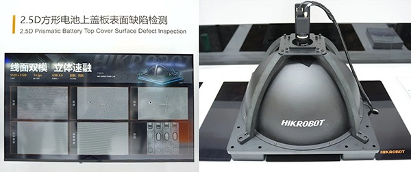 海康机器人全新推出面阵2.5D视觉检测系统,采用穹顶光分区照明技术,同时支持线扫光度立体成像方式,在样品移动过程中完成采集和2.5D图像融合,提高检测效率。此次展示的是该系统检测方壳锂电池盖板上划痕、凹坑等缺陷。
