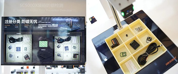 本次展示了SC5000X智能相机在生产打包环节进行装箱防错检测。相机实时检测打包装箱过程,只有当所有物料在方向、位置和类型上均正确才会放行。相机采用边缘学习AI算法,无需联网即可训练AI模型,低门槛、高效率,且便于后续追溯和管理。