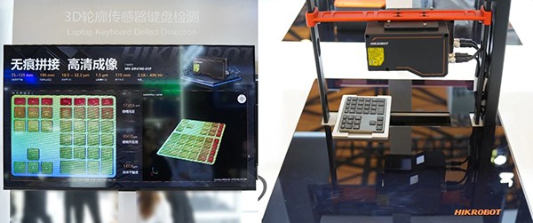 在键盘检测展位,两台高精度3D激光轮廓传感器,各拍摄键盘的一半区域,通过拼接融合算法生成一幅完整图像,还原产品真实、完整的外貌,可以准确检测不同颜色、不同材质、不同尺寸的键盘。
