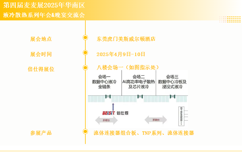 倍仕得BEISIT作为麦麦展年度合作伙伴和晚宴特别赞助单位,将如期参展,同时带来数据中心&新能源“液冷”高安全液冷连接及电气安全解决方案,我们诚邀您莅临指导交流!