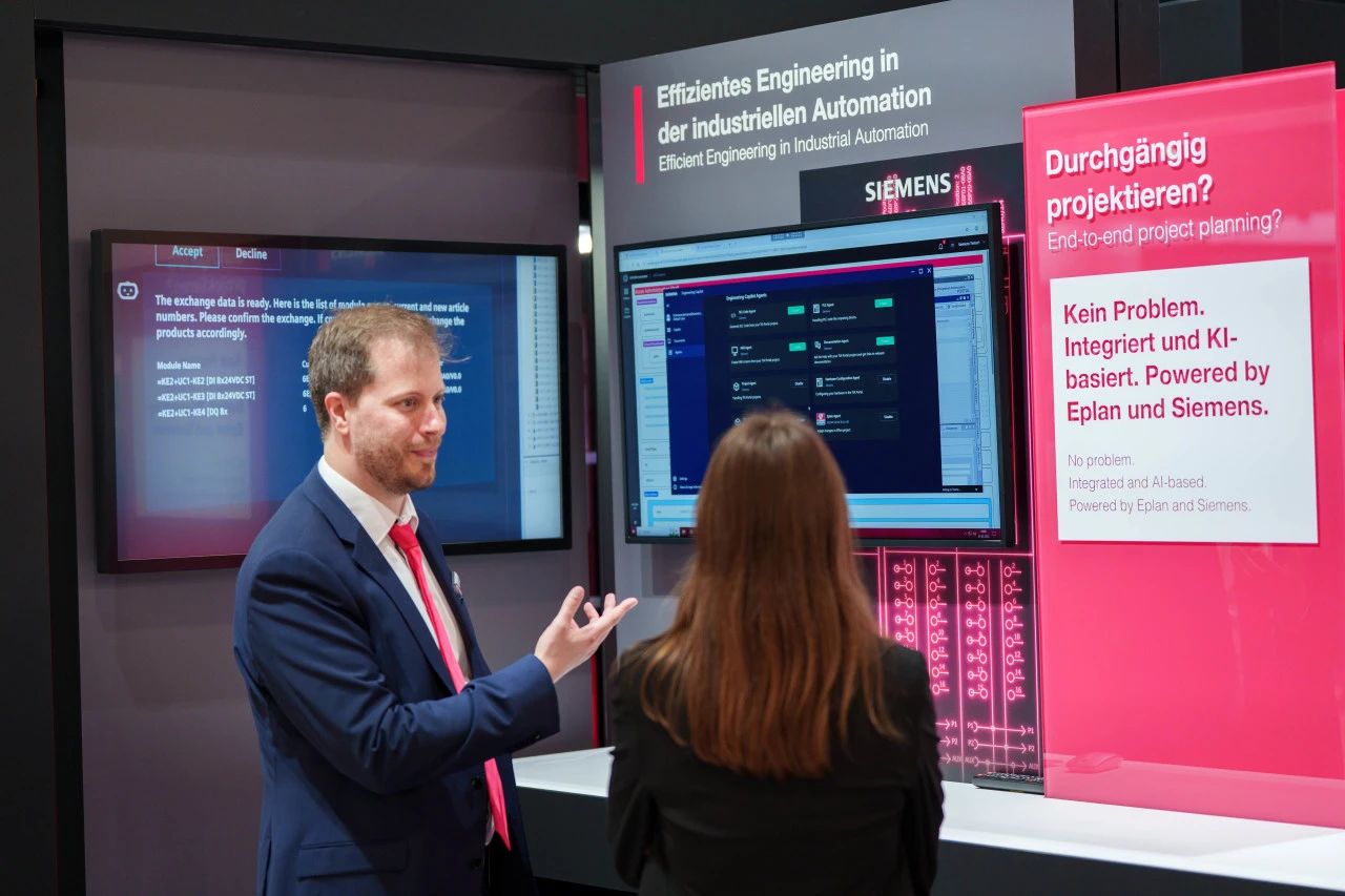 在汉诺威工业博览会上,威图和易盼现场解答有关AI如何帮助电气设计师、工程师和规划师以创新方式优化日常工作的各种问题。威图和易盼已经整合了多个现实案例,譬如基于微软Azure OpenAI服务,通过AI辅助技术生成安装板布局图纸。此外,易盼与西门子达成合作,推动端到端深度集成,致力于未来实现整个工作流程的数字化与自动化。