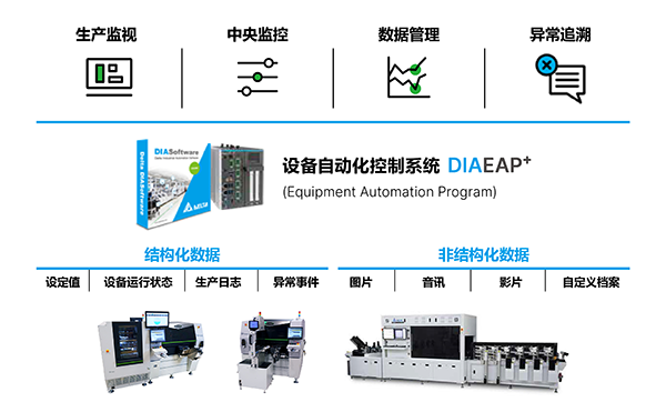通过对此厂商生产系统全面诊断后,台达凭借其敏锐的洞察力发现,尽管此厂商已经完成了自动化设备的升级改造,但主要聚焦在生产层面,设备的管理监控、安全预警以及后期的产品、工艺质量优化等与未与生产系统做好连接,从自动化到智能化的进程还有欠缺。为此,台达首先导入了DIAEAP+设备自动化控制系统。