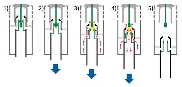 2) 动触头向下动作并压缩气体。