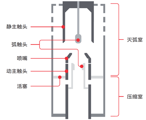 ABB的压气式负荷开关的灭弧装置由动、静主触头、弧触头和活塞组成,其工作原理是利用活塞压缩气体产生的超压来 “吹灭”电弧,开断负荷电流。在压气式开关合闸时,电弧预击穿发生在弧触头。在分闸时,电弧同样引燃于弧触头,整个合分闸过程的电弧作用都集中在弧触头上,降低了主触头的损耗,延长了设备的维护周期,提高了设备的使用寿命和稳定性,而且相对于采用真空泡串联或并联的开断技术,压气式灭弧技术触头结构更简单,更加稳定可靠。