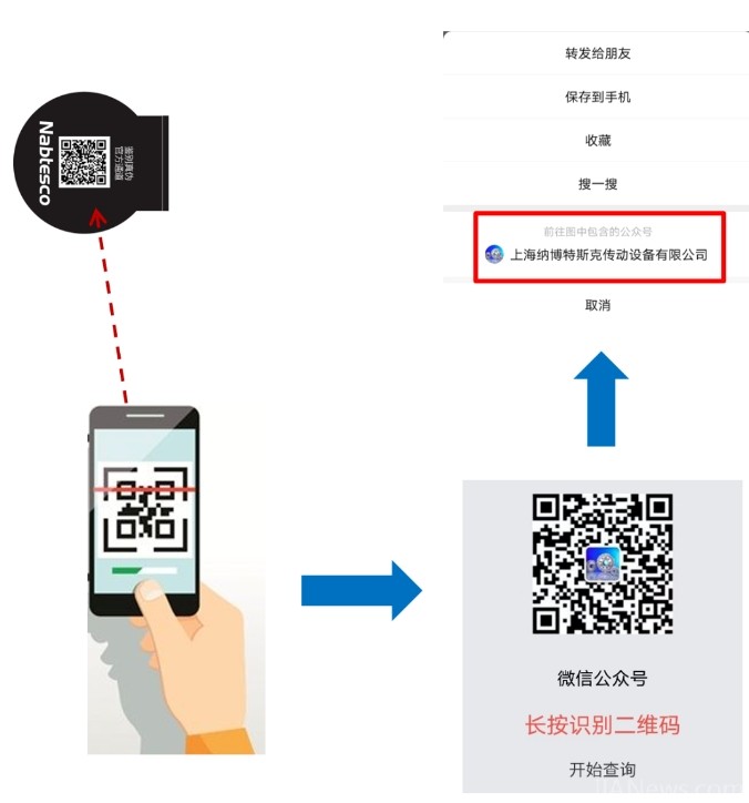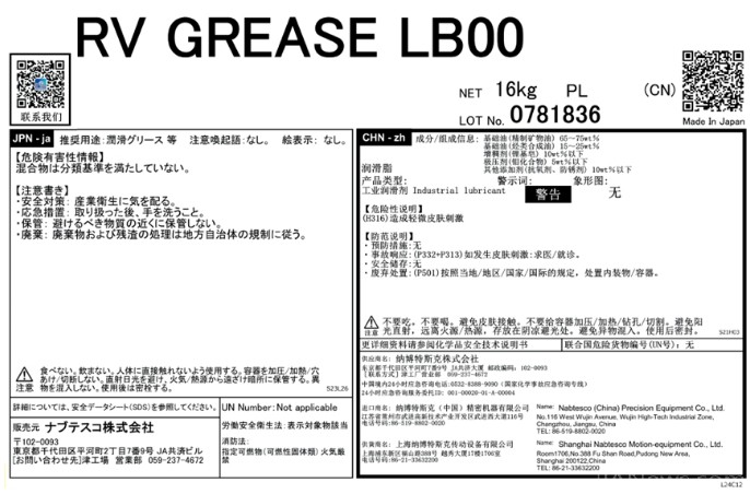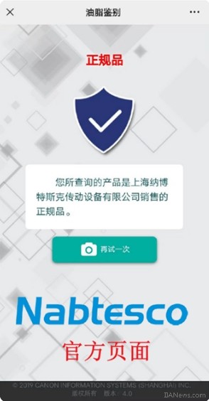 提示:如采购时遇到标签上未标有“Nabtesco”LOGO,或者使用微信“扫一扫”功能扫描二维码后未进入官方公众号(上海纳博特斯克传动设备有限公司),而是进入其他鉴别页面的,则该张标签及润滑剂有被仿冒造假的风险。请勿开封使用,立即联系纳博特斯克。