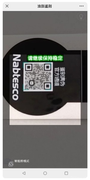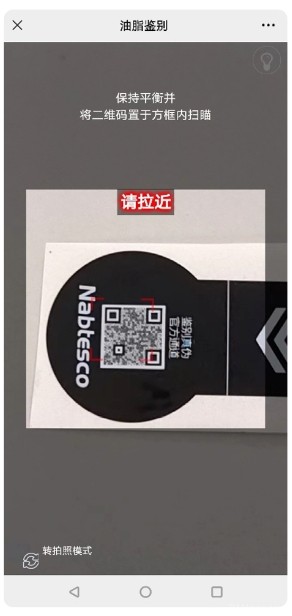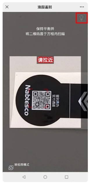 A:请在步骤⑧时的自动识别模式画面,打开右上角的手机闪光灯图标。打开闪光灯后,请避免灯光在油脂标签二维码上的反射。