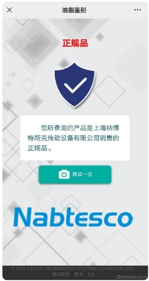 1、验证结果页面无“Nabtesco”LOGO可能存在假冒风险。