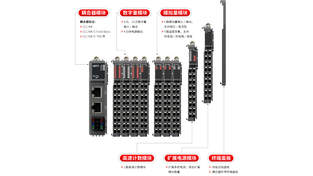 菱领LR1系列片式I/O产品采用插片式结构设计,一个耦合器最大可扩展32个片式I/O模块。