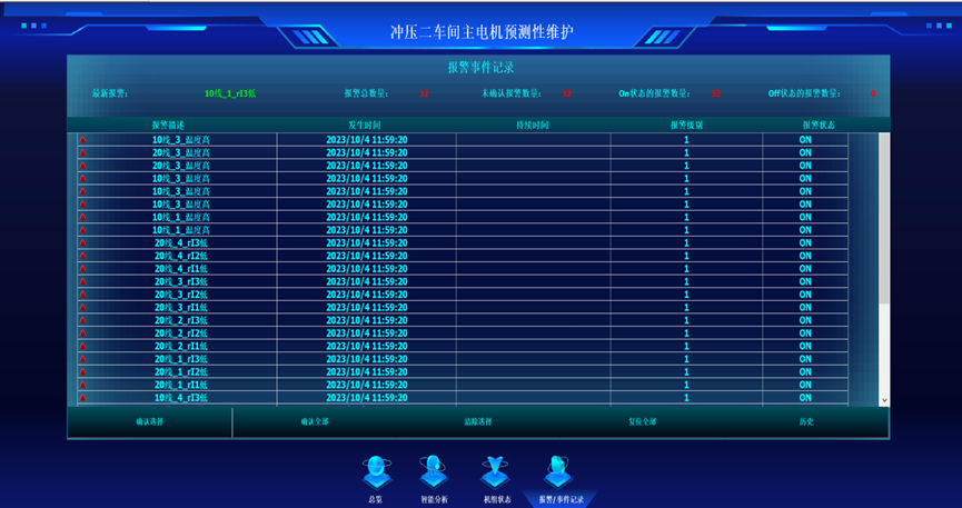 除此之外也提取了电机的电流电压、加工模具的编号和生产状态(包括电机启动信号,模具切换信号,恢复生产信号、压力机PLC报警信号等)。
