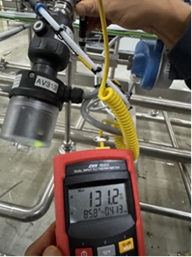 1、精度升级:客户将传感器替换为iTHERM QuickSens后,温度数值由121℃更新为131℃,精准显示管道内清洗介质温度