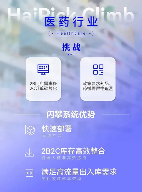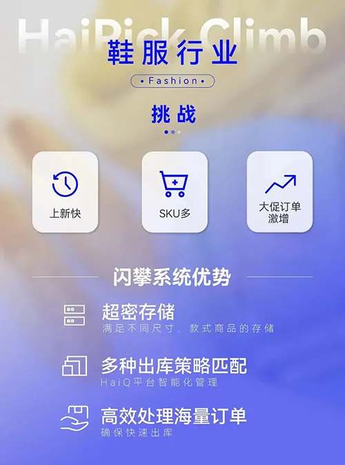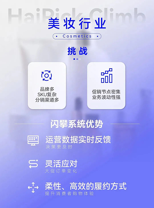 闪攀系统可适用于鞋服、跨境电商、医药、美妆等行业仓库里的小件拆零拣选场景。