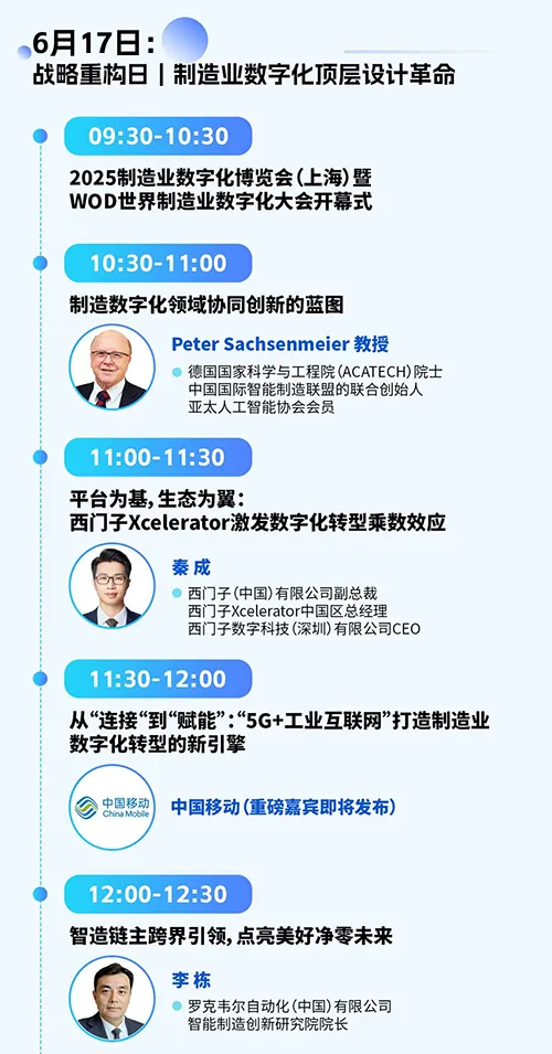 同期举办的WOD世界制造业数字化大会、系列WOD数字化转型高峰论坛数字化工作坊、主题社交活动等10余场活动设置18个前沿议题,主题聚焦黑灯工厂、智慧供应链构建、人工智能、ESG转型与数字化协同等,同时设置食品饮料、电子行业数字化转型专场,届时将集结来自广汽埃安、美云智数、赛意信息、施耐德电气、SGS通标、惠生海工、欧普照明、京东物流、今天国际、KUKA(中国)、旺旺集团、西得乐、布勒、青岛啤酒等企业代表进行数字化实战分享,为来自汽车、电子、装备、石化、食品饮料等行业的制造业数字化负责人提供丰富、多元的参与场景,提升数字化系统认知,重塑数字化领导力。