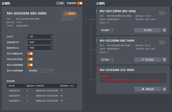 组网参数集中显示,从相机的关系图、基本状态以及取流结果等信息,配置更加方便直观,帮助用户快速了解主从相机的工作状态,排查异常问题更加方便快速。