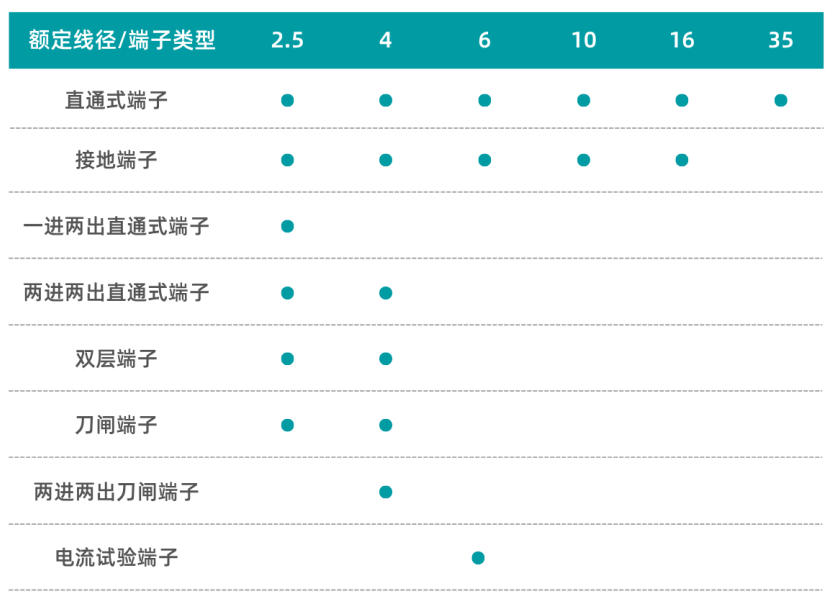 额定线径覆盖2,5mm²-35mm²,包含直通和功能型等多种端子类型。