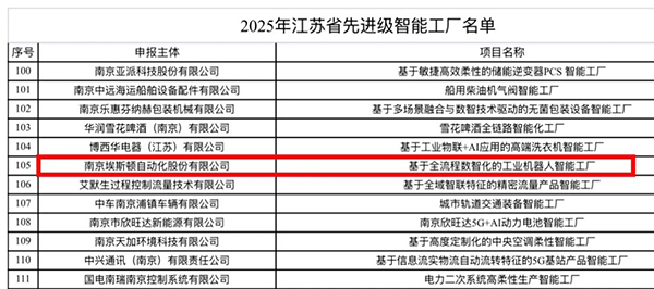 近日,江苏省工信厅公示2025年江苏省先进级智能工厂名单,埃斯顿自动化股份有限公司以基于全流程数智化的工业机器人智能工厂荣获2025年度江苏省级先进级智能工厂称号。这一荣誉不仅是对埃斯顿技术实力与创新能力的认可,更是其深耕智能制造、推动产业升级的又一里程碑。