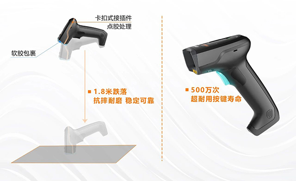 采用创新结构设计,通过软胶包裹工艺显著提升产品耐磨性和抗跌落冲击能力,其卡扣式接插件配合点胶处理工艺,确保各部件连接更加稳固可靠。经严格测试,产品可承受1.8米高度50次跌落冲击,按键寿命高达500万次,充分满足工业场景下的高强度使用需求。