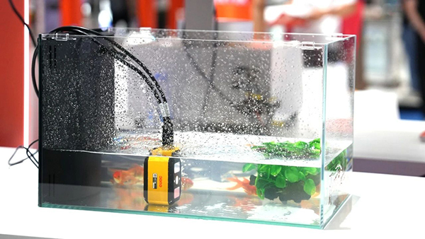 工业环境复杂,常受到温湿度、振动、噪音等因素的影响,对设备的稳定性要求极高。研祥金码打造“水下读码”场景,明星产品R-6000系列智能读码器在现场大秀硬核本领,IP65的防护等级无惧水下、振动干扰,为观众献上读取率≥99.99%的亮眼表现。
