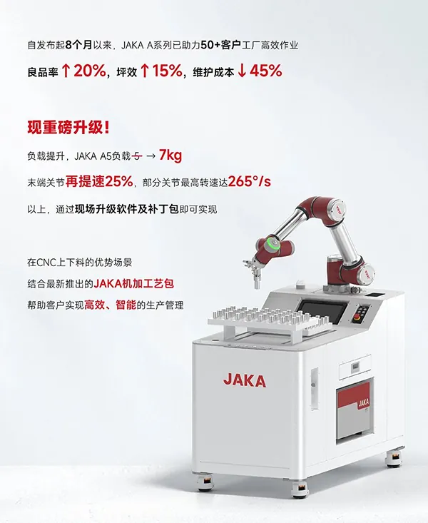 JAKA A系列机器人与机加工艺包的完美结合,为制造业的智能化转型提供了强有力的技术支持,将让企业的生产管理将更加轻松高效。