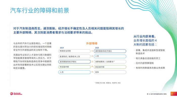 劳动力已成为汽车企业面临的紧迫挑战,这标志着调研结果较去年呈现显著变化。与此同时,网络安全相关的担忧有所下降,这表明许多制造商在保障数字环境安全方面已取得了进展。