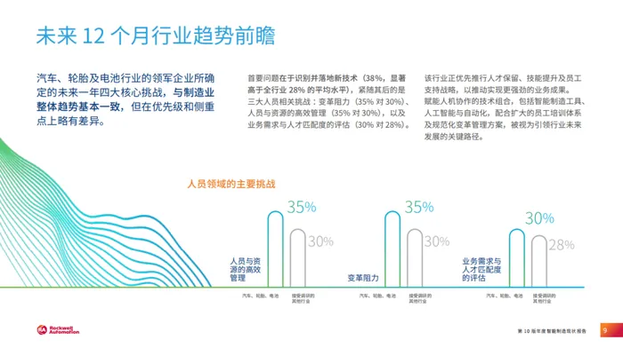 作为工业自动化、信息化和数字化转型领域的全球领先企业之一,罗克韦尔自动化近日公布了第十版年度《智能制造现状报告:汽车版》的调研结果。这项全球调研共收到了130位负责人的回复,涵盖来自 15 个国家和地区的汽车及轮胎制造商、原始设备制造商、工程采购公司和系统集成商。结果显示,为了保持竞争力,汽车行业正积极拥抱变革。