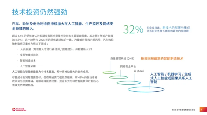 汽车及轮胎制造商持续加大在 AI 、生产监控及网络安全领域的投入。超过 62% 的受访者认为,技术投资的主要驱动因素是对业务的长期影响,其次是扩张或产能提升 (58%) ,这一趋势与 2025 年的总体调研结论一致。