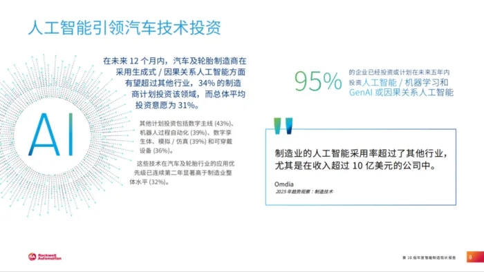 与 2023 年相比,如今的汽车行业将 AI 崛起视为风险的比例显著降低(2025 年为 14%,2023 年为 24%),质量控制、机器人技术与流程优化成为主要 AI 用例。在生成式人工智能 (GenAI) 、机器人流程自动化 (RPA) 及数字化工具的计划投资方面,汽车企业的投入力度处于领跑位置。