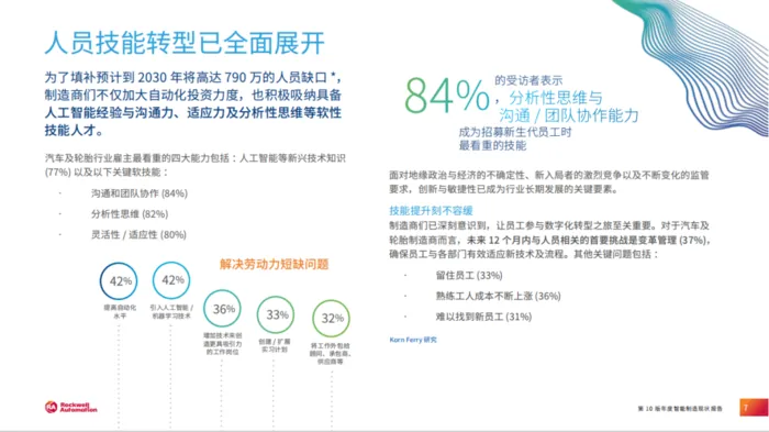 为填补到 2030 年预计高达 790 万的劳动力缺口*,制造商们不仅正加大对自动化的投资力度,也正积极招募具备 AI 经验的人才,以及具备沟通能力、适应能力和分析性思维等软性技能的人才。