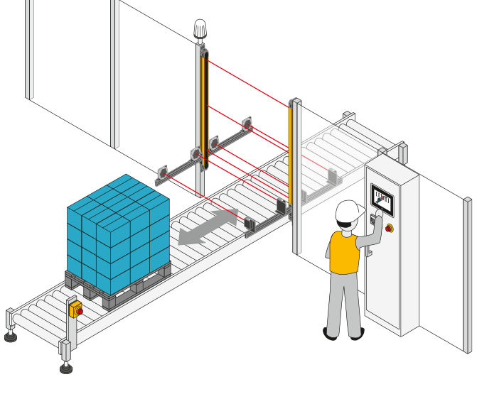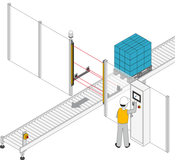 安全光幕是现代工业生产中一种常见的安全防护装置,用于检测人员或物体是否进入危险区域。在一些特定场景下,我们希望货物能够顺利通过光幕不引发停机,而当人员误入危险区域时则立即停机。安全光幕的这种“人货区分”的功能,也叫屏蔽(muting),在标准IEC 62046(Safety of machinery – Application of protective equipment to detect the presence of persons),对应国标GB/T 29483-2013中有针对屏蔽功能的详细说明。屏蔽主要有三种方式:L型屏蔽、X型屏蔽和T型屏蔽,一般需要通过2个或4个屏蔽传感器与光幕配合使用来实现。