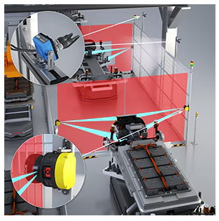 Cox:为了进一步提高电池生产的安全性,在集成自动导引车辆系统 (AGV) 和工业机器人单元时,考虑具体的安全措施尤为重要。AGV 应配备前沿的安全系统,以确保安全的运行速度和合适的保护区域。激光扫描仪(如 microScan3 或 nanoScan3)可实现对环境的有效监控。通过相关的安全控制器和软件(如 Flexi Soft Safety Controller 或 Flexi Mobile)优化 AGV 的保护区域和驾驶方式,以达到所需的安全等级(如当有人靠近时 AGV 自动减速)。